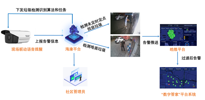皓維響應垃圾定點投放的相關監管政策,基于海康威視AI開放平臺快速實現定制化場景AI算法,并結合“數字管家”平臺系統,助力街道監管平臺實現智能化升級。