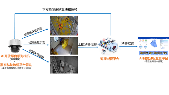 智能攝像機(jī)采集醫(yī)療廢物暫存間視頻圖像,通過海康威視AI開放平臺生成的算法模型識別工作人員未戴手套、未穿膠鞋、腳踩醫(yī)療廢物等醫(yī)療廢物處置問題,形成預(yù)警事件信息,并傳送至AI視覺分析監(jiān)管平臺。