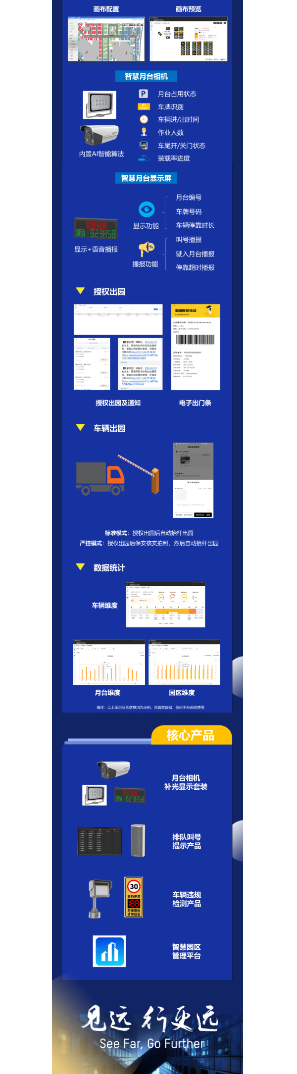 覆蓋園區門崗、月臺、單證室等作業場景,實現園區物流車輛預約、審批、排隊、叫號、入園、月臺作業及授權出園等全鏈路的線上化數字化智能化管理,提效降本。